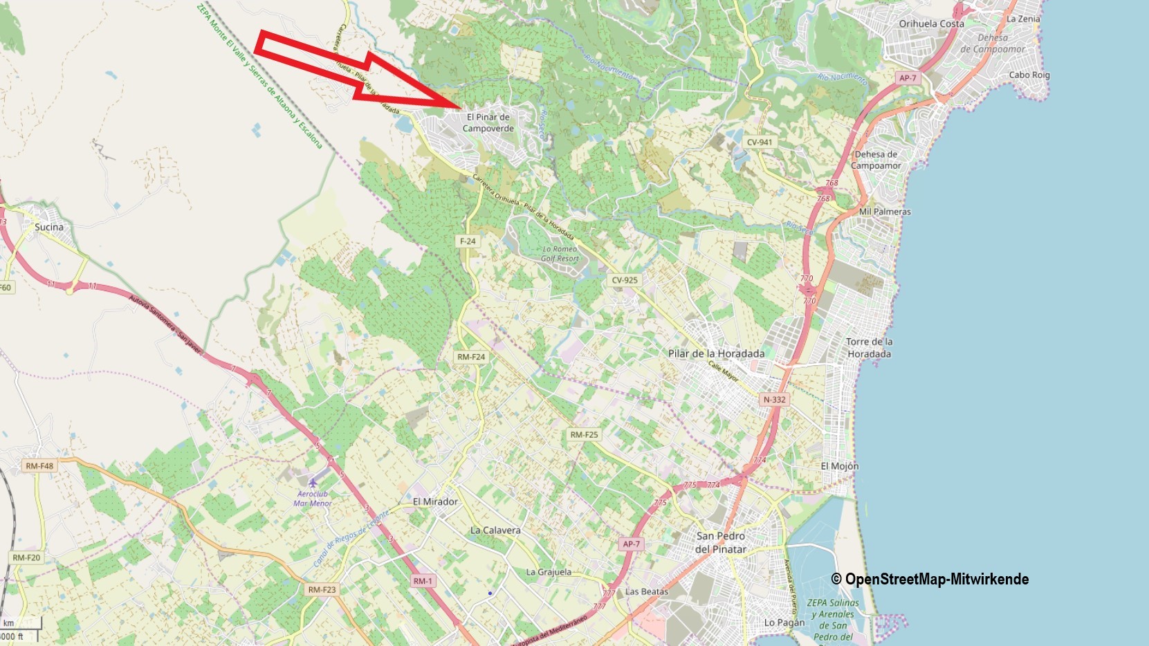 Von Alicante kommend fährt man die N332 Richtung Torrevieja. In Pilar de la Horadada verläßt man die N332 in Richtung Oriella auf der C925. In Campoverde am zweiten Kreisel biegt man rechts ab und bleibt auf der Straße bis zur Kirche.